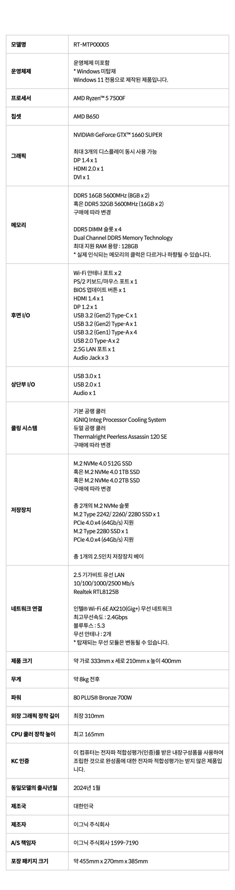RIT 2024 리트 미들타워 7516S 라이젠5 라이젠 7000 시리즈 지포스 GTX 1660 SUPER > 컴퓨터